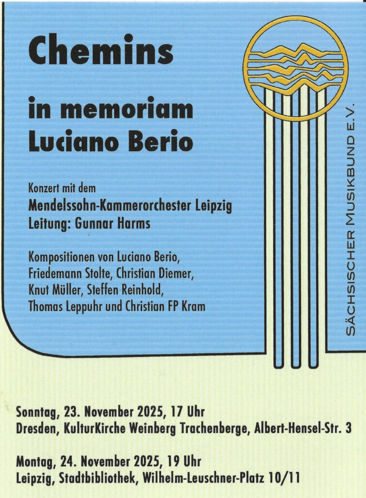 Uraufführung von Glosse für Streich-Kammerorchester am 23. November 2025, 17 Uhr, Dresden, KulturKirche und am 24. November 2025, 19 Uhr, Leipzig, Stadtbibliothek im Rahmen des Konzertes „Chemins – in memoriam Luciano Berio“ (Veranstalter: Sächsischer Musikbund). Mit dem Mendelssohn-Kammerorchester Leipzig, Leitung: Gunnar Harms und Kompositionen von Luciano Berio, Friedemann Stolte, Christian Diemer, Knut Müller, Steffen Reinhold, Thomas Leppuhr und Christian FP Kram.